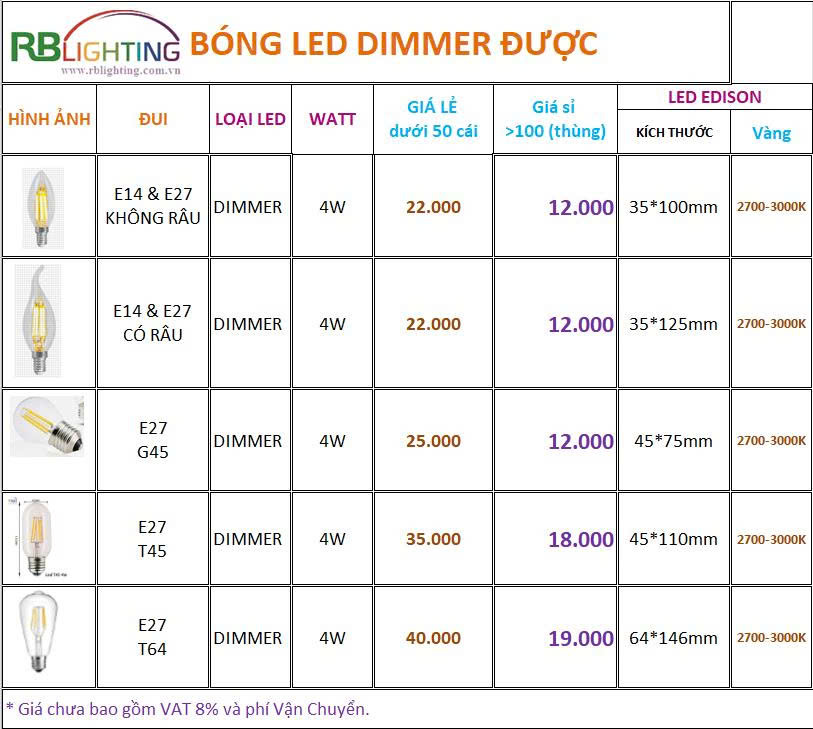 * BẢNG GIÁ BÓNG LED EDISON DIMMER